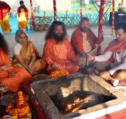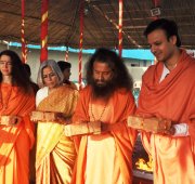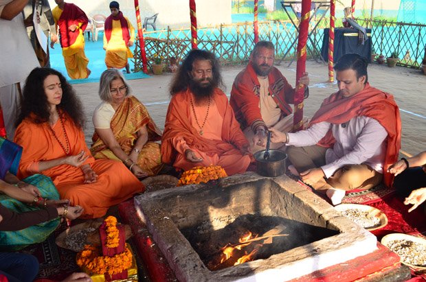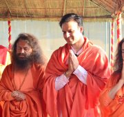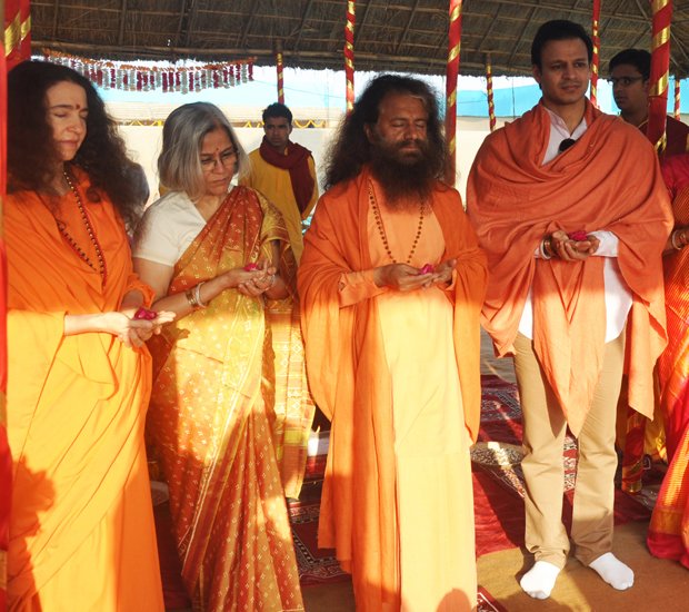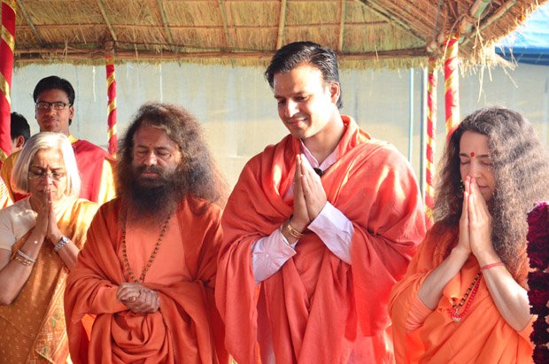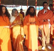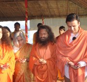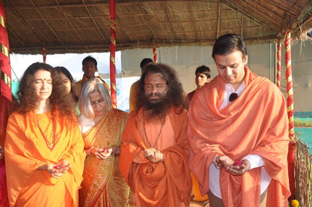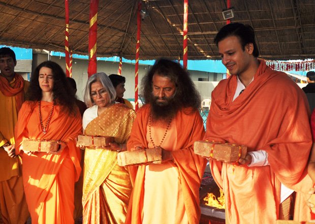 Today at the final day of the Kumbha Mela, Vivek Oberoi took a pledge for the construction of the first 2 toilet complexes being built by a partnership between Ganga Action Parivar, DRDO and FICCI. Led by Pujya Swami Chidanand Saraswatiji, the Founder of Ganga Action Parivar and President of Parmarth Niketan Ashram, Rishikesh, Vivek performed puja, yagna and a ceremonial “bhoomi puja” blessing for bricks to be used in the eco-friendly, bio-digester toilet complexes. The first toilet complex built by the partnership of Ganga Action Parivar, DRDO and FICCI was inaugurated at Parmarth Niketan Ashram, Rishikesh by the hands of the Honourable Governor of Uttarakhand; the second toilet complex was inaugurated at Parmarth Niketan Ashram, Rishikesh, by the hands of revered saints of all the world’s religions at a huge “Environmental Protection for World Peace” event held on November 3, 2012 in honor of Pujya Swami Chidanandji’s 60th birthday. Now, further complexes are being built throughout Uttarakhand, and plans are underway for construction in Uttar Pradesh as well, including here in Allahabad. The 2 toilet complexes sponsored by Vivek will be located here in Allahabad and in the sacred teerth of Badrinath.