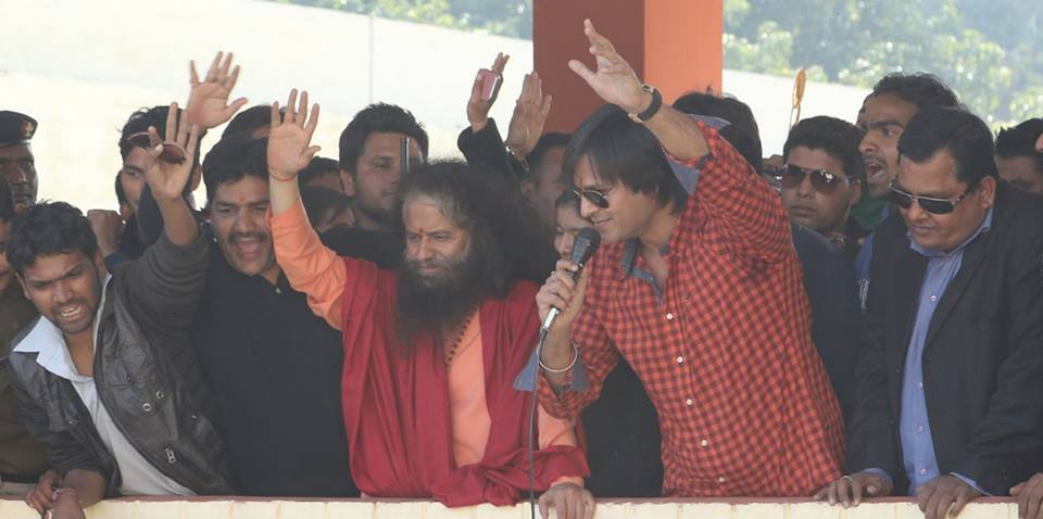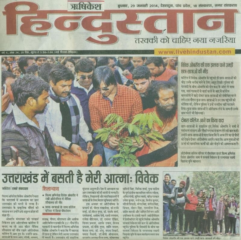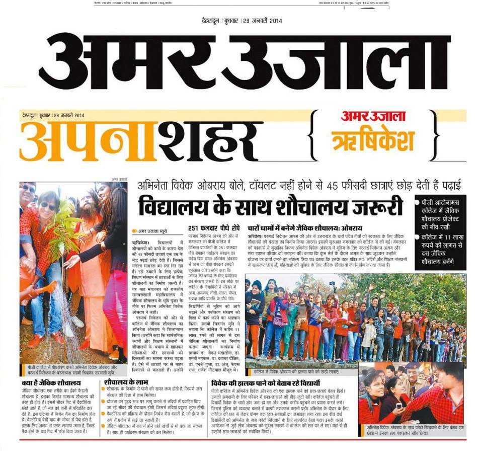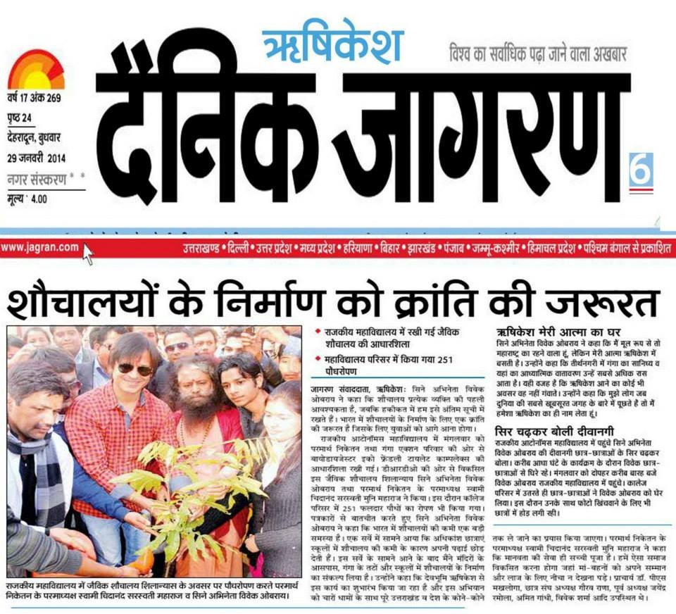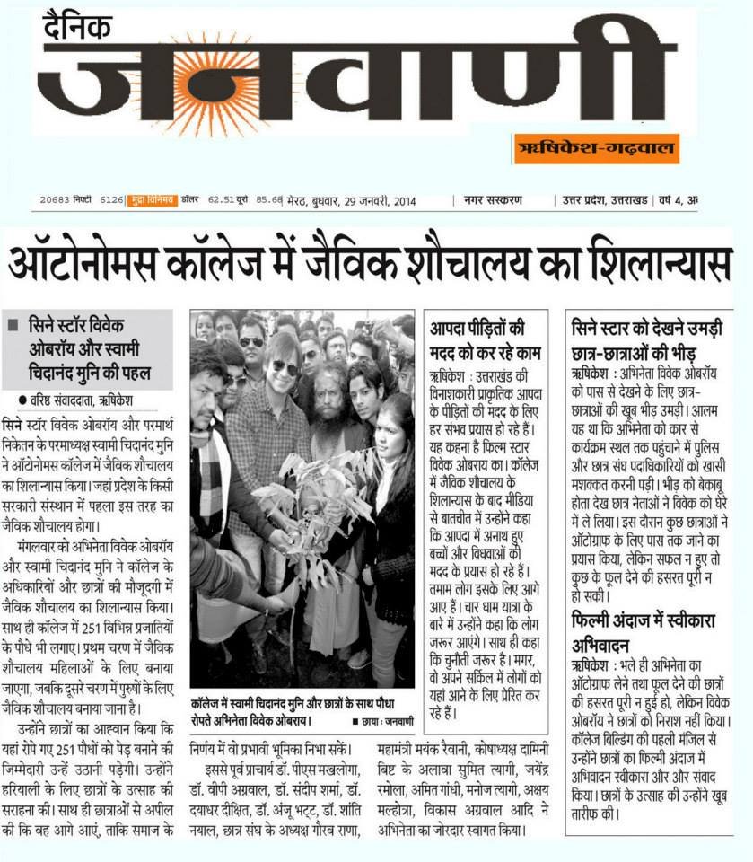 Pujya Swami Chidanand Saraswatiji, President of Parmarth Niketan and Founder of Ganga Action Parivar (GAP) and Global Interfaith WASH Alliance-India, inspired Vivek Oberoi, famous Bollywood actor and humanitarian, to lay the first foundation stones for the bio-toilet complex in LMS Degree College (Rishikesh). The bio-toilet is part of GAP’s 6T’s (Toilets, Trees, Taps, Trash, Tracks and Tigers) Programme that has been conceived and has thrived under Pujya Swamiji’s vision and leadership. With this spirit, after the foundation stone ceremony Pujya Swamiji and Vivek Oberoi took part in a tree plantation in the campus premises.