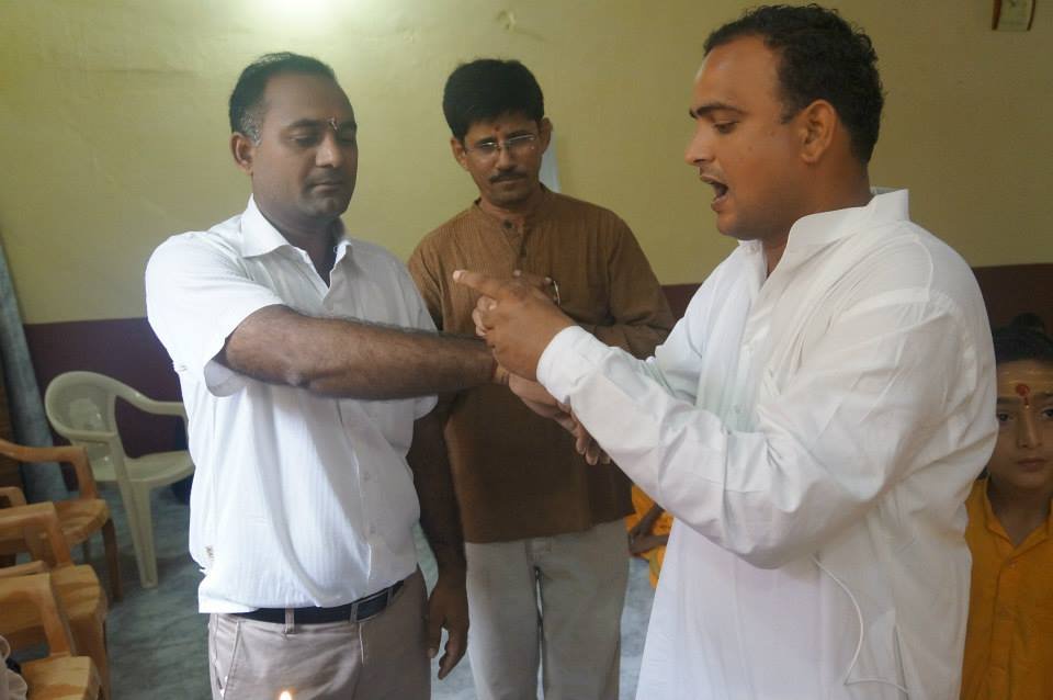 This yagno pavit ceremony is a very important sanskara- a ‘rite of passage’-symbolizing the transition of a child from the infantile stage of play to their next more serious stage. Under the consistent blessing and guidance of their Guru, who serves as their divine guardian and teacher, and through the three important practices of self-study, sadhana and seva they align themselves with the sangam or the confluence of the holy trinity.