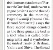 A very special Raksha Bandhan ceremony took place at Parmarth Niketan (Rishikesh) today. The Rishikumars (students of the Parmarth Gurukul) underwent a yagno pavit (sacred thread) ceremony in the morning. The three sacred strings denote, as Pujya Swamiji explains, the three gunas – sattva (reality), rajas (passion), and tamas (darkness) which are tied together in a knot. The knot is called brahmagranthi which symbolizes the united trinity of Brahma, Vishnu and Mahesh (Shiva).
