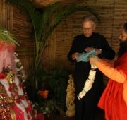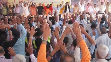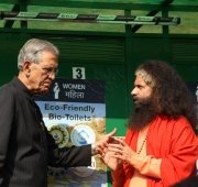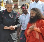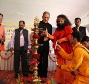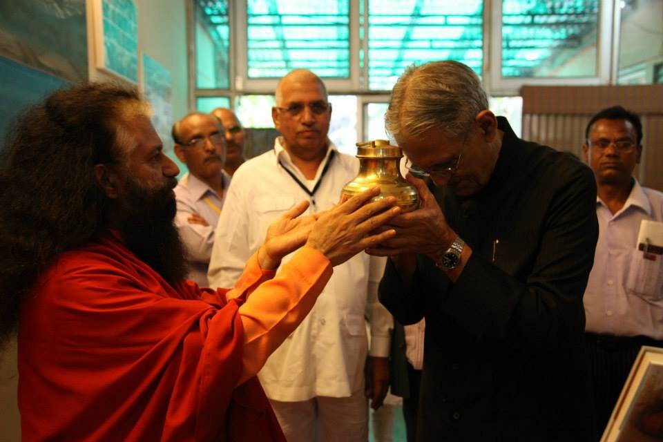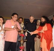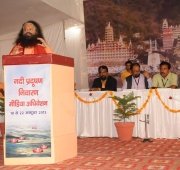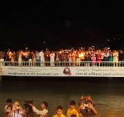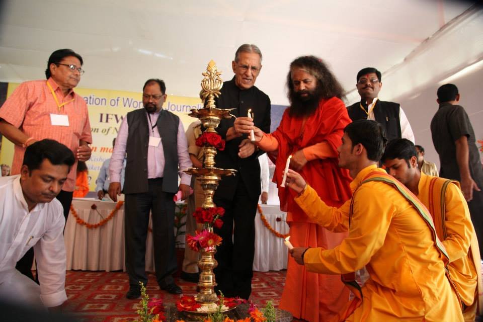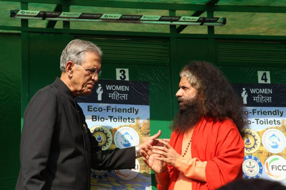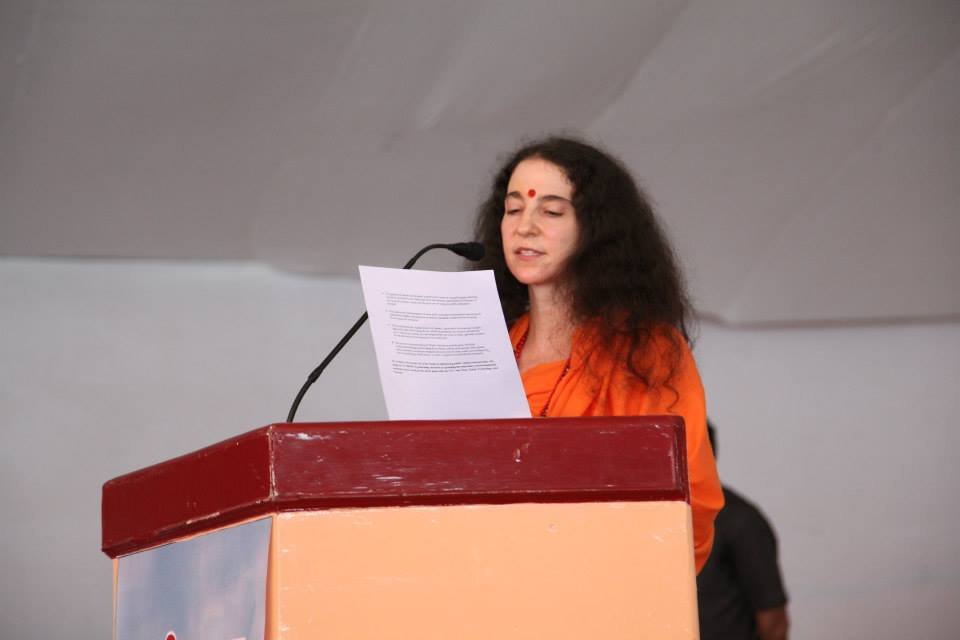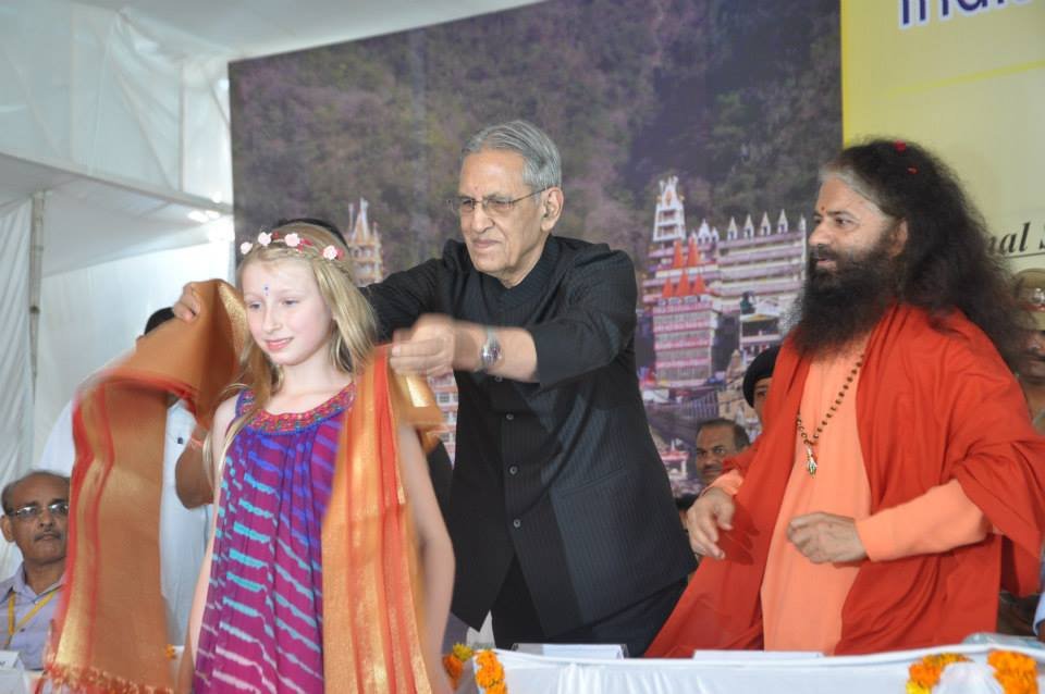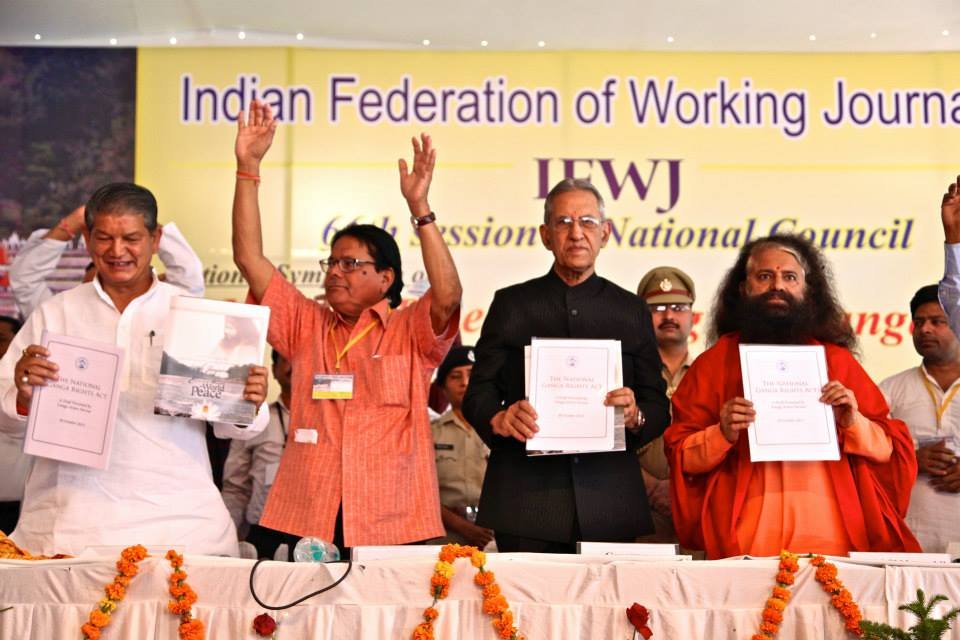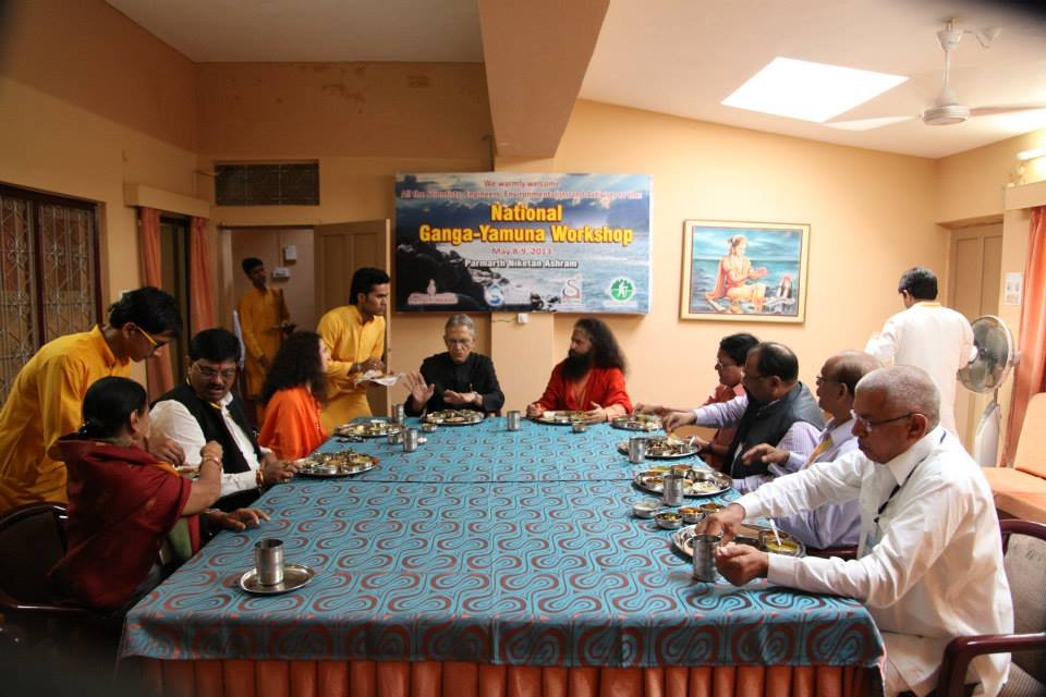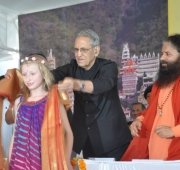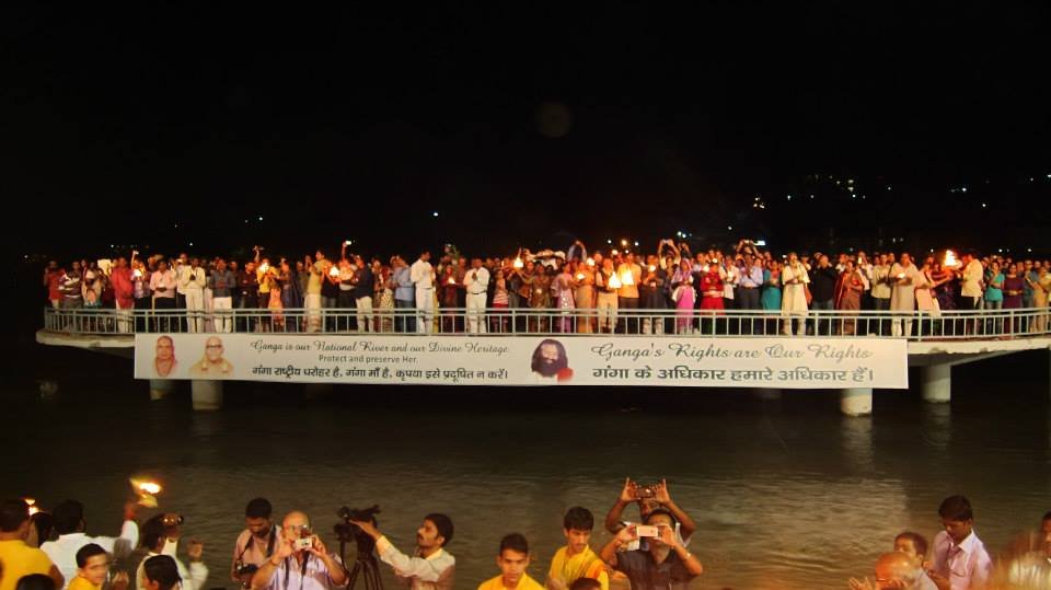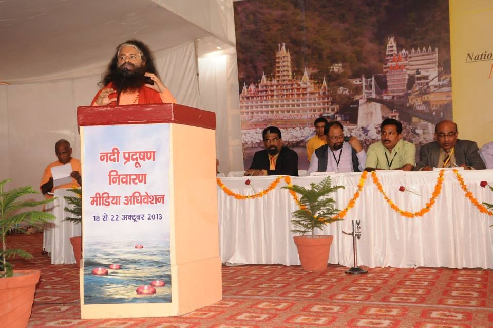 The historic Declaration was presented by Pujya Swamiji to Shri B.L. Joshiji, the Hon’ble Governor of Uttar Pradesh and to Shri Harish Rawatji, the Respected Minister for Water Resources, Government of India. The gathered journalists, alongside Respected Union Minister for Water Resources, Shri Harish Rawatji, Uttar Pradesh Governor, HE Shri B.L. Joshiji, HH Pujya Swami Chidanand Saraswatiji and other respected saints and dignitaries, spontaneously took to their feet and raised their hands in a dramatic pledge of support for the historic Declaration.