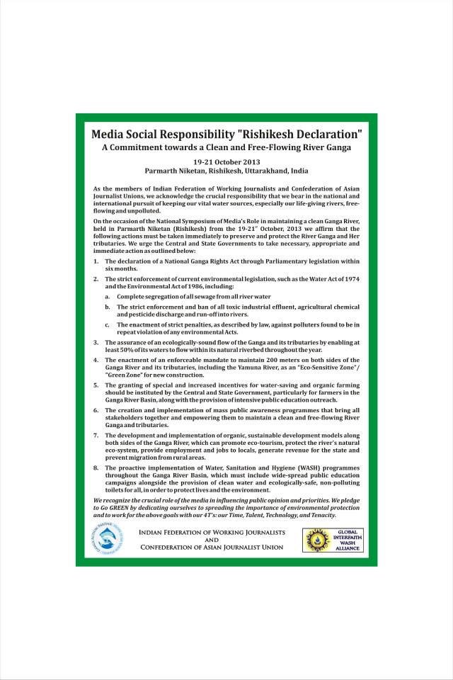 The Declaration urges specific and immediate actions from the Central and State Governments to preserve the sanctity and cleanliness of the River Ganga and its tributaries. The journalists acknowledged the crucial responsibility that the media bears in the national and international pursuit of keeping vital water sources, especially life-giving rivers, free-flowing and unpolluted.
