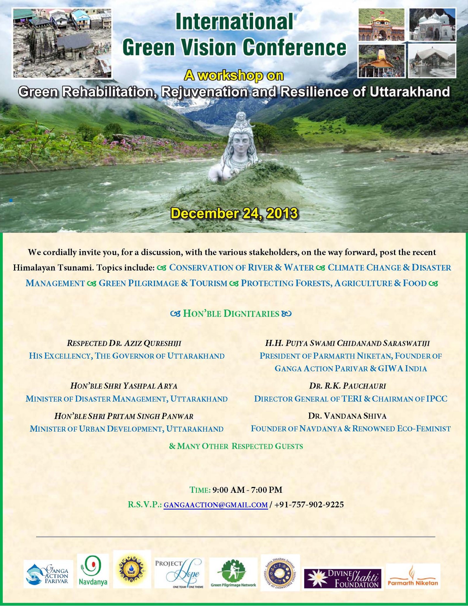 Eminent environmentalists, scientists, revered spiritual-religious leaders, dedicated members of the civil society and affected members of local population and esteemed members of administration came together in a conference organized by Ganga Action Parivar, Parmarth Niketan, GIWA-India and Navdanya, to share their experience, expertise and vision to pave the path to a Green Uttarakhand. The focus of the discussions was how to transform the recent tragic Himalayan Tsunami into an opportunity to develop sustainable, eco-friendly ways of growing in concert with the environment, thereby transforming a bane into a boon for the sacred and beautiful land of the Himalayas.