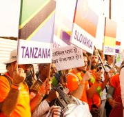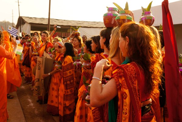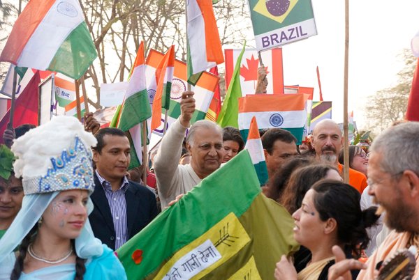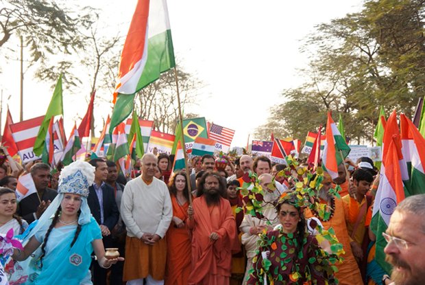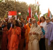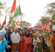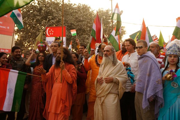 Led by His Holiness Puyja Swami Chidanand Saraswati, Founder of Ganga Action Parivar and President of Parmarth Niketan Ashram, Rishikesh, participants from of all castes, creeds and cultures came together to call for an Indian “Clean Revolution.” The parade-goers, hailing from more than 54 countries, as well as students from the Northeast states of India, waved their national flags, colorful banners and slogan-signs calling for all to keep Mother India and Mother Ganga pollution-free.