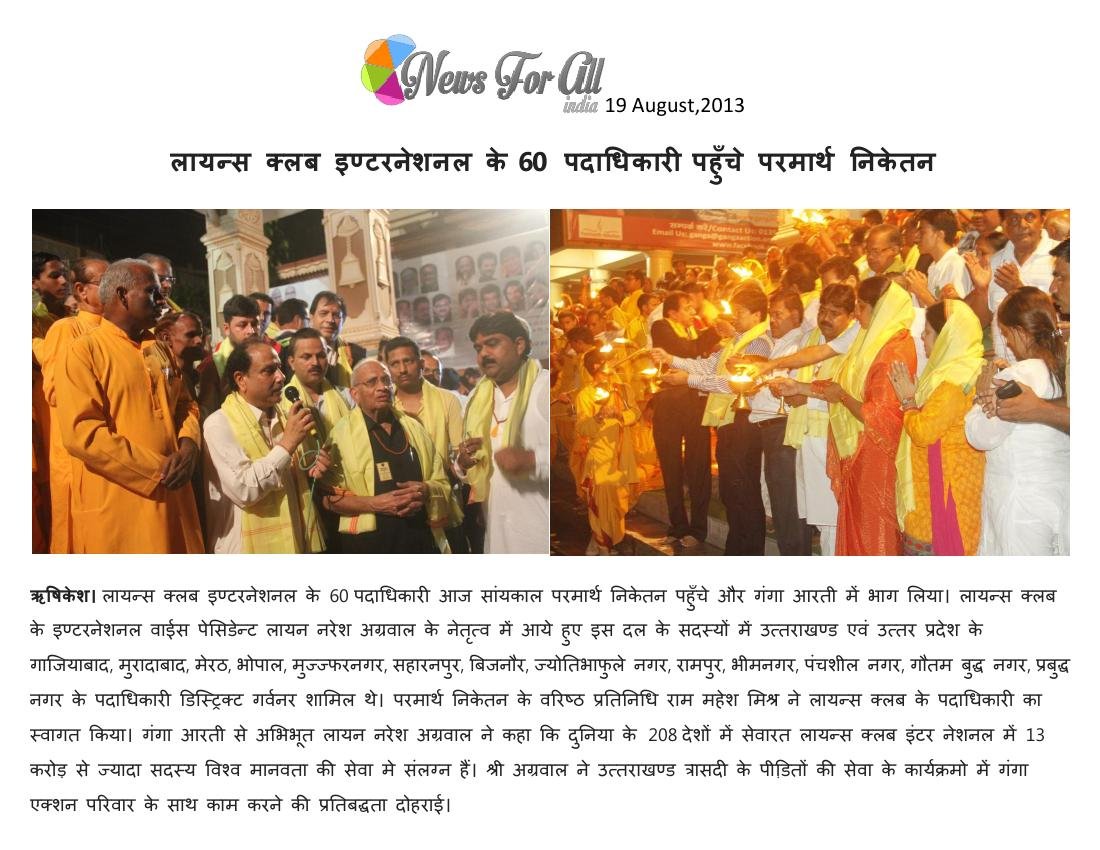 Inspired by the divine vision and leadership of Pujya Swamiji and under the direction of Shri Naresh Agarwal, V.P International Wing, Lion’s Club, an esteemed team of over 60 national Lion’s chapter heads and members came home to Parmarth Niketan for the Ganga Aarti on the 18th August.