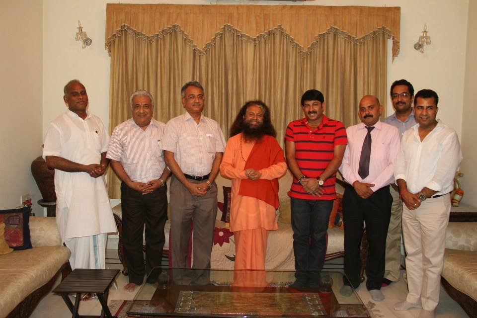 This was followed by a meeting between Pujya Swamiji, Shri Nirankar Saxenaji, Senior Director of FICCI, Dr. S Radhakrishnanji, Director DI2TM DRDO, and other members of DRDO and FICCI to discuss the progress of the bio-toilets and water-taps project. Pujya Swamiji encouraged the DRDO scientists and experts to plan a meeting soon with IIT scientists and experts to discuss ways in which the smartest minds of India can dedicate their time, talent and technology for the welfare of the nation together, especially in addressing important issues such as the restoration of our rivers and sanitation for all. They were joined by famous actor and singer Shri Manoj Tiwariji, who had come to receive blessings from Pujya Swamiji before making his way back to Mumbai. Shri Manojji was eager to help raise awareness about bio-digester toilets in all of the villages of India, especially Bihar and Uttar Pradesh. He later discussed with Pujya Swamiji detailed plans of a mass awareness campaign that he would like to lead to bring more people to be part of the Ganga Parivar. He also explained in reverence his time with Pujya Swamiji in Rishikesh, during Pujya Bhaishriji’s Green Katha last month, saying that a “Gangs of Ganga” Bhakt CD (a play on Shri Tiwariji’s recent work on the “Gangs of Wasseypur” film) would soon be launched at Parmarth and would kick-start the outreach campaign.