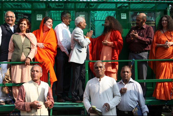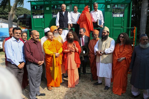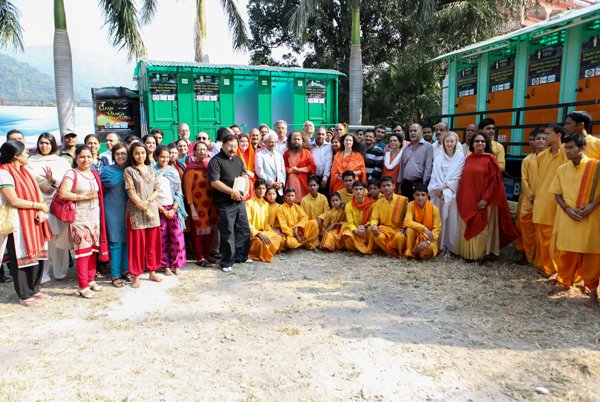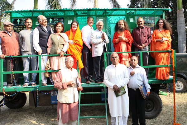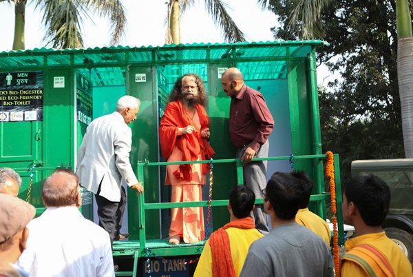 Before all the saints and distinguished guests left on the morning of the 4th, all gathered to inaugurate the first mobile bio-toilets.  These toilets, which use the same technology as the permanent bio-digester toilet blocks (as built and inaugurated at Parmarth on the 15th October), are specifically designed in vehicles to be able to bring proper sanitation to festivals, melas and other events.