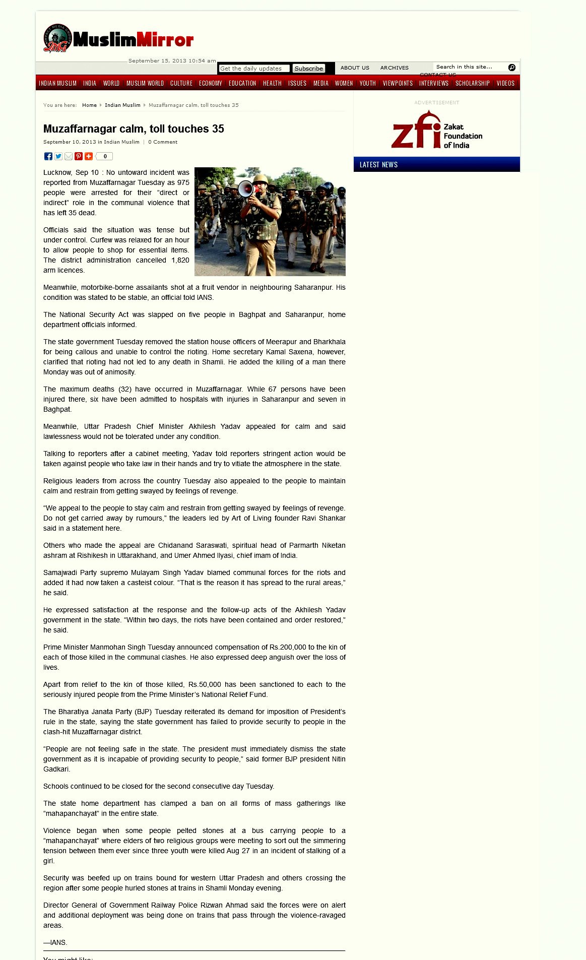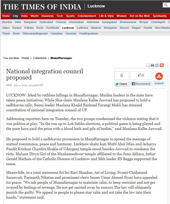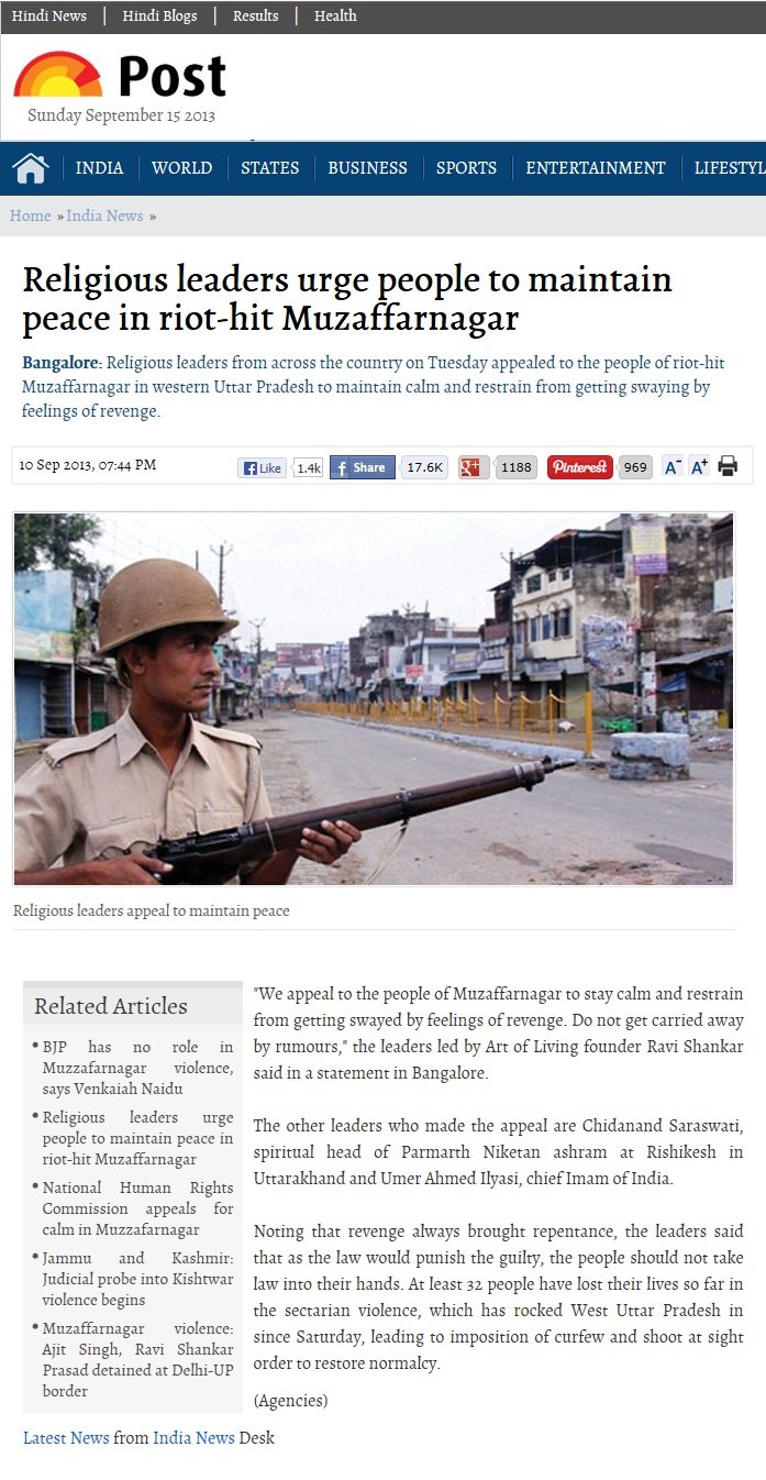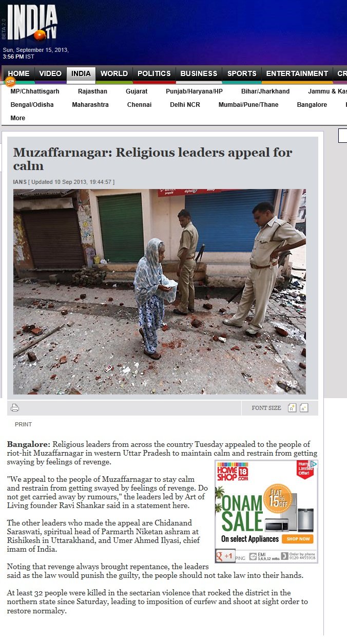 After discussions with Head of All India Imams Organization, Imam Umer Ilyasiji and many top Muslim leaders, Pujya Swamiji reached out to Founder of Art Of Living, Pujya Sri Sri Ravi Shankarji, Pujya Atmaswaroop Swamiji, Akshardham Temple (Delhi) and the interfaith community to collectively send a message of peace to the city of Muzzafarnagar.