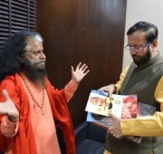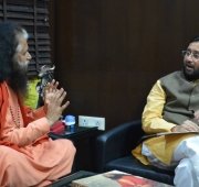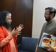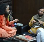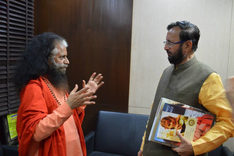 Pujya Swamiji met with Shri Prakash Javadekarji, the Hon’ble Minister of Environment and Forests, Information Technology and Broadcasting, and discussed the various technologies that could be utilized to clean up the sacred River Ganga. He shared about boats designed to patrol the banks of rivers, eating up and segregating the solid waste and liquid waste from the fresh water. The discussed how these technologies were functional in other parts of the world and could be utilized in the first phase of the Clean Ganga plan to illustrate immediate results.